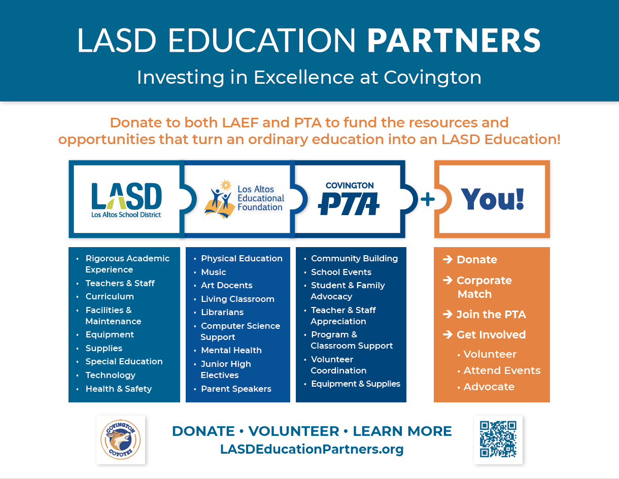 The Los Altos School District (LASD) blends critical thinking and creativity to deliver a well-rounded learning experience for our community’s children. LASD is regularly ranked in the top 1% of all school districts in California. The funding LASD receives from public sources – including both federal and state governments, as well as funds from local property and parcel taxes – is insufficient to allow LASD to provide this rich educational experience on its own. To make up for this shortfall, the Los Altos Educational Foundation (LAEF) and each school’s PTA work closely together to bridge the funding gap so that an excellent education is provided to all children at their individual campuses.